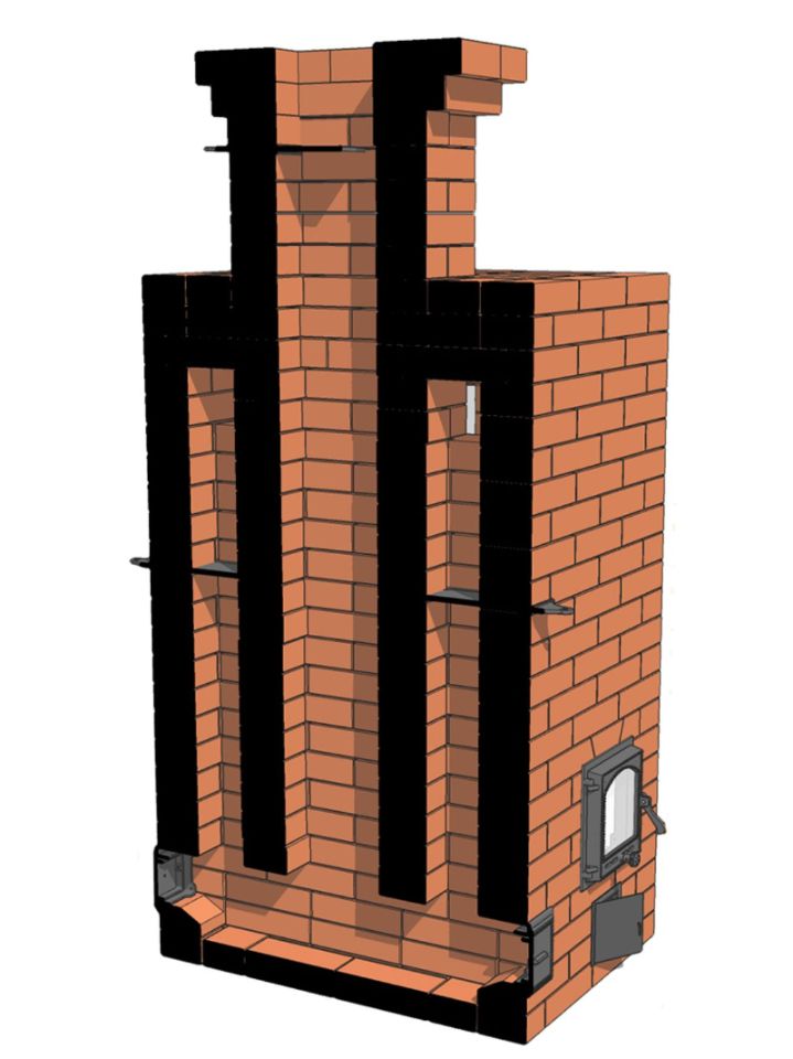 Из верхней камеры дымовые газы отводятся в обогревательный щиток, который имеет два боковых опускных канала и один подъемный, переходящий в дымовую трубу. Опускные каналы имеют отдельные задвижки. Когда камни достаточно нагреты, эти задвижки можно закрыть, чтобы остановить движение газов через каменку и замедлить остывание чугунно-каменой закладки. А средний, подъемный канал может использоваться как вытяжка.