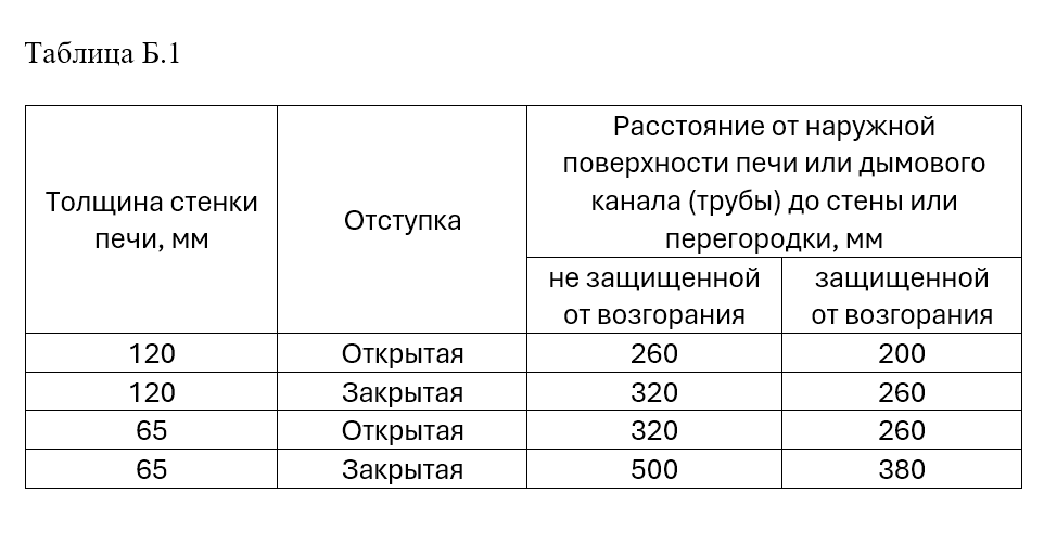Б.1 Размеры разделок печей и дымовых каналов с учетом толщины стенки печи следует принимать равными 500 мм до конструкций зданий из горючих материалов и 380 мм — до конструкций, защищенных в соответствии с подпунктом «б» пункта 5.21.